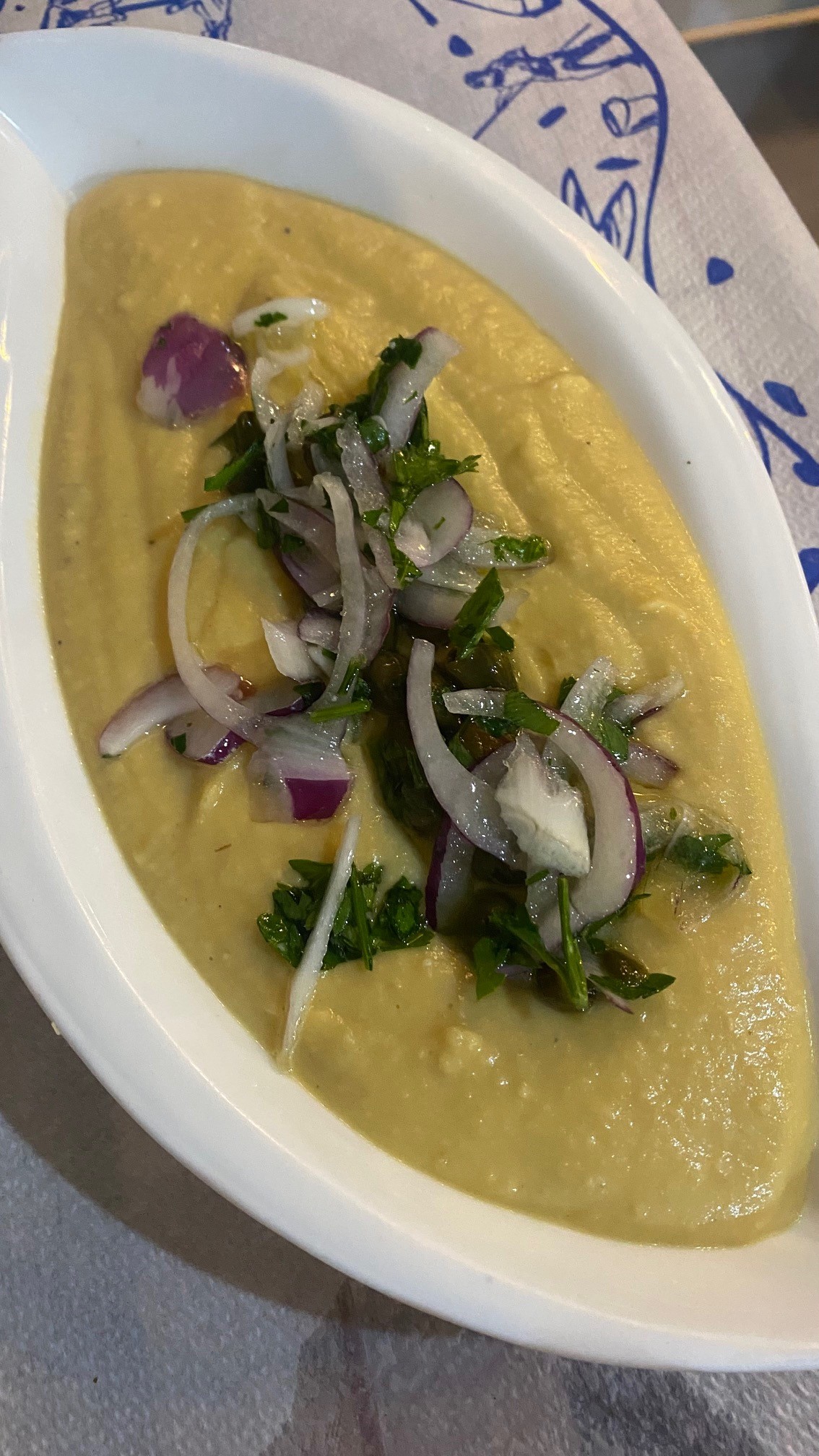 Many years later, while dining at a popular taverna in Santorini, I was pleasantly surprised to find a familiar dish from my childhood among the various appetisers (mezedes in Greek). The fava, this creamy, yellow mash, was reminiscent of the veggie stew I used to eat, although it was served with capers and red onion rather than sausages. I appreciate the simplicity of Mediterranean cuisine, which showcases the deliciousness of locally sourced, high-quality ingredients. I had to get this recipe!