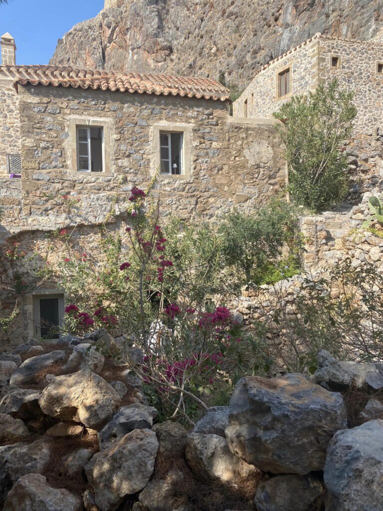 As the road widened, a gate reminiscent of a mediaeval castle appeared before us. We passed through a narrow tunnel, where a bag of clean linens and a few vegetable crates sat on stone benches on the left. It felt like we had stepped back in time: a winding cobblestone road led to the mediaeval town. As its name—”single entrance”—suggests”, Monemvasia has provided protection for its inhabitants since the 6th century. The settlement is completely invisible from the mainland. At the time of the fortress’s founding, it could only be approached by boat. A wooden bridge later connected it to the mainland. The stone bridge, which we can comfortably walk across today, was built in 1971.