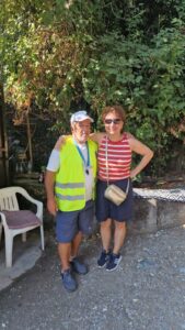 We went up on Agiou Dimitriou Street to the cemetery and continued on its right. Because of the heat and the constantly arriving tourist buses, I recommend going early morning for this hike and finishing around 10.30 at the latest. The Enipeas Gorge is easy to reach; a narrow footpath leads the way, offering absolutely amazing views of the massive mountain all around. At the beginning of the route, an elderly man greeted us with a broad smile. After chatting a bit in Greek, he gave us some advice on which way to go, how much time we need and where to be careful along the path. He also offered us to use the toilets behind him on the way back; it turned out he was the one looking after them. He was so friendly and cheerful that I had to take a picture with him.