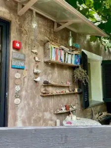 A couple of scenes from the Mamma Mia movie were filmed in Pelion (alongside Skiathos and Skopelos islands), so because we were already on the eastern side of the peninsula, we could not leave out Damouchari, the small fishing port and the base of the local sea-kayaking company. From the parking lot I used the stairs to get down to the beach. At the corner of the staircase, I found the “Ghermaniko”, the charming guest house where the crew stayed during the filming. The tiny port was very quiet, so it wasn’t easy to imagine Donna coming down with her old jeep to meet her besties, Tanya and Rosie.